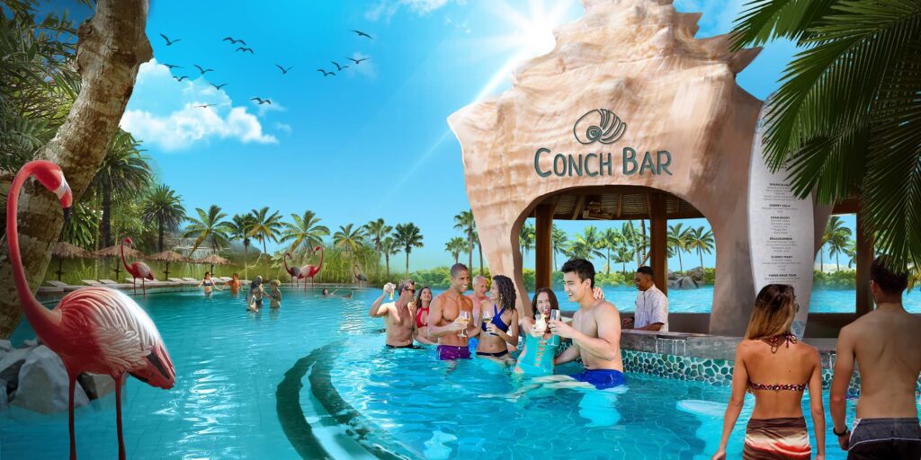 In the former, visitors can dance to the rhythm of music while sipping cocktails by the pool, or venture out with inflatables on the waters of a lazy river.